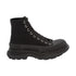 Black canvas lace-up boot with a lightweight oversized rubber tread sole. The boot is detailed with a textured rubber wrap and tonal Alexander McQueen signature, finished with a signature ribbon on the back of boot. Round toe shape boot silhoutte details rubber toe cap.