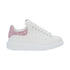 White smooth calf leather lace-up sneaker trimmed with an antique pink croc-embossed heel counter. The sneaker features large flat laces and an oversized rubber sole. Finished with an Alexander McQueen signature on the tongue and heel counter. Oversized rubber sole with signature stamp design. The sneaker comes with an additional set of shoelaces.