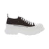 Black canvas lace-up with a thick oversized rubber tread sole. The lace-up is detailed with a textured rubber wrap and tonal Alexander McQueen signature, finished with a signature ribbon on the heel of shoe. Round toe shape silhouette details rubber toe cap.