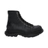Black Polyfaille lace-up boot with a lightweight oversized rubber tread sole featuring a printed McQueen Graffiti logo. The boot is detailed with a textured rubber wrap and tonal Alexander McQueen signature, finished with a signature ribbon on the back of boot. Round toe shape boot silhouette details rubber toe cap.