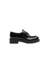 Emphasized by the iconic enameled triangle logo, these retro-inspired loafers are made of brushed leather, traditionally used in classic fine footwear and reinterpreted in Prada collections on unexpected designs for a hybrid result that reflects the duality of the brand. The notched effect of the welt around the shoe gives it a handcrafted touch.