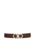 Sleek and stylish with fabulous Ferragamo accents, this calf leather belt has a pattern of embossed mini Gancini on both sides. In two tones, the strap flips at the buckle to open up more styling options and the adjustable length ensures the perfect fit. The Gancini buckle is in a palladium finish with a central metal plate embossed with the iconic signature for a chic personal touch.