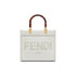 Small Sunshine Shopper bag made of white leather with hot-stamped FENDI ROMA lettering and stiff tortoiseshell plexiglass handles.