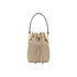 • Small bucket bag with drawstring fastening and metal decorations in the form of the Fendi logo. The bag has two detachable shoulder straps, one long and one short, to wear the bag over the shoulder or cross-body. Made of beige calfskin leather. Gold metalware.