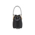 Small bucket bag with drawstring fastening and metal decorations in the form of the Fendi logo. The bag has two detachable shoulder straps, one long and one short, to wear the bag over the shoulder or cross-body. Made of black calfskin leather. Gold metalware.