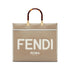 • Medium Sunshine shopper made of dove gray leather, featuring leather threading and hot-stamped white FENDI ROMA lettering. Stiff tortoiseshell-effect plexiglass handles.