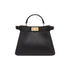 Small, iconic Peekaboo ISeeU bag made of black leather and embellished with the classic twist lock on both sides.