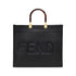 Medium Sunshine Shopper bag made from black leather with heat-stamped “FENDI ROMA” and stiff tortoiseshell plexiglass handles.