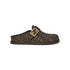 • Round-toed sabots with FF strap. Made of brown and tobacco FF jacquard fabric. Details in brown leather. Gold-finish metalware.