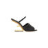 • Fendi First sandals with wide band and strap. Made of black interlaced leather. Diagonal F-shaped sculpted heel in gold-colored metal.
