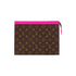 - This Pochette Voyage pouch is made from Monogram Macassar coated canvas with cowhide-leather trim in a bright colorway. The interior is lined with matching-colored leather and features six card slots as well as an inside flat pocket. The pouch closes with a silver-color zipper.