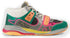 Turquoise and grey suede, grey and black mesh, and pink reflective fabric