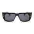 - Oversized frame, wide temples, embossed gold-tone Balmain logo on side, gold-tone finishes, gray anti-glare lenses, 100% UV protection