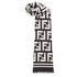 Rectangular black wool and silk knitted scarf with all-over FF motif. Trimmed with a striped border in matching tones.