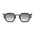 - A unisex graphic shape with rims carved out of a 4mm engraved metal strip. The frame is enlivened by our new geometric bridge and features traditional end pieces. Shiny black acetate & alloy frame treated with a carbon black layer. Grey gradient lenses