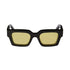 Black sunglasses featuring white arrows at side. Rectangular shape and yellow lens. Logo engraved on the lens.