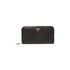 A curved-edged Saffiano leather wallet containing 1 bill compartment with zipper, 12 credit card slots, 6 document pockets and 1 coin compartment with zipper. The piece is finished with the Prada logo and zipper closure.