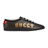A culmination of various inspirations and nostalgic references, the Spring Summer 2018 collection pays homage to eighties video gaming culture, reintroducing the Guccy print in a graphic font that draws inspiration from the SEGA logo—a fixture in the colorful arcades and coin-op game rooms of the time. The emblem is combined with a stars motif in a metallic gold print set against the leather Falacer low-top sneaker.