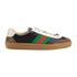 Inspired by retro basketball shoes from the '70s, these sneakers are defined by an unexpected mix of materials. A black leather base is trimmed in white leather and brown suede. A play on the classic Web, the nylon side stripe is presented in saturated shades of green and orange and treated for a vintage effect. Pulled straight from Gucci handbags, an enameled oval detail defined by the Double G enriches the front laces.