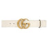 Inspired by an archival design, the Double G emblem is crafted from brass hardware with an antiqued finish. Placed on a smooth white leather belt.