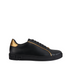 Closed, rounded toe, laced leather low-top sneakers, with gold trims, micro Medusa Icon front, Greek Key heel and stacked rubber sole.