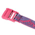 Purple industrial belt with fuchsia graphics and buckle. "Off-White™ BELT" carved on buckle.
