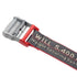 Grey and red industrial belt with silver buckle. "Off-White BELT" carved on buckle. Red buckle detail.