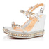 The Pyraclou is Maison Christian Louboutin’s nod to the classic espadrille sandal, created following the lines of the iconic Pyra Riad last. The sandal perches atop a towering 110 mm wedge platform sole and features slim straps adorned with glossy silver spikes. This new season model is crafted in ultra-soft pure Bianco calfskin leather, for instant fresh, summery appeal.