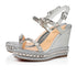 The Pyraclou is Maison Christian Louboutin’s nod to the classic espadrille sandal, created following the lines of the iconic Pyra Riad last. The sandal perches atop a towering 110 mm wedge platform sole and features slim straps adorned with glossy silver spikes. This model is crafted in a blend of striking silvers showcasing both Glitter Mini and Specchio Silver materials.