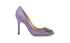 Lilac satin almond toe pumps featuring a Swarovski crystal buckle and a stiletto high heel.