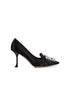 Pumps in silk satin with gros grain trims and front buckle with Swarovski crystals. Inspired by the Versailles gardens, the new buckle features perfect symmetry, rendering this footwear precious and elegant.