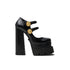 A statement runway design, these patent pumps feature a high block heel and a double platform. These Mary Jane style platforms are characterized by ankle straps adorned with decorative Medusa hardware. The style has a treaded Greca sole with a hidden Medusa underneath the heel.
