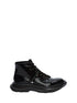 Black shiny calfskin leather lace boot with silver-finished metal hardware, contrast stitching and a thick exaggerated rubber tread sole. Boot silhouette with a round toe shape. Finished with an Alexander McQueen signature on the tongue.