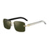 - Sunglasses in white horn with a smooth golden finish, rectangular shape, green lenses and class 3 solar protection. Dimensions: lenses 58 mm, bridge 17 mm, temples 140 mm.