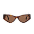 Cat-eye, Havana acetate O’Lock glasses. Temples with gold metal oversized O’Lock logo and brown lenses.