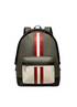 The Harper backpack is made from leather in multicolored khaki and dusty white and opens to reveal a central compartment that can hold up to a MacBook 15in laptop, as well as having internal flat pockets and a zipped pocket for organising cables and other accessories. Lined with a water-resistant techno nylon, this men's backpack also features a top handle, front pocket with zip closure, Bally Stripe detailing and a padded back panel and shoulder straps.
