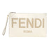Large pouch with removable bracelet handle. Zip fastening. Made of white leather with hot-stamped FENDI ROMA motif. Gold-finish metalware.